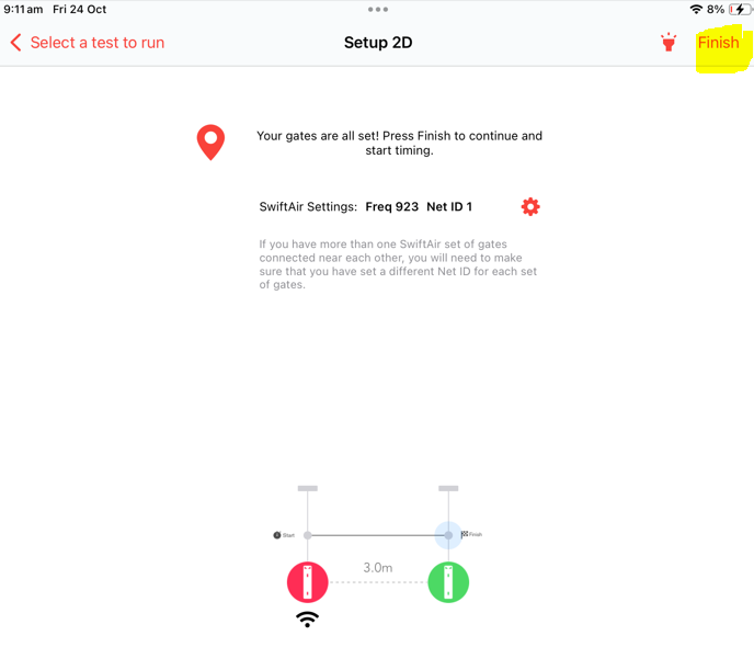 - When all gates are aligned you will see "finsh" in the top right hand corner. Tap this to advance to the run-test page.