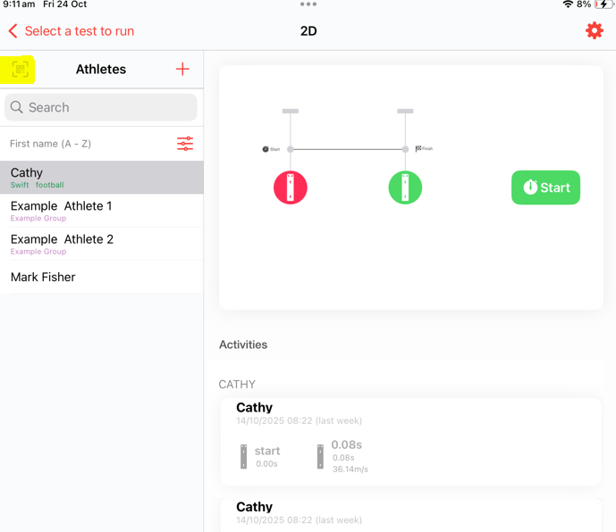 - You can also use the QR code scanner function in the top right hand corner if you have prepared QR code stickers for your athlete. Read this article for details